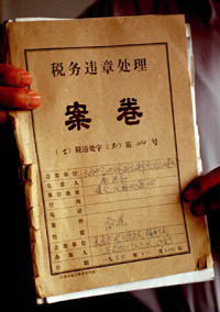 7月29日,長(zhǎng)春市地方稅務(wù)局稽查分局查到李洪志偷稅的證據(jù)。1992年到1994年3年中,李洪志在傳授“ 法輪功”的經(jīng)營(yíng)行為中,偷稅8655.9元。這是稽查分局1994年對(duì)李洪志偷稅事件進(jìn)行查處的案卷。 新華社記者徐 家軍攝(傳真照片)