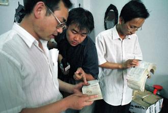 吉林省有關部門7月27日查實,不讓“法輪功”練習者看病、吃藥的李洪志本人既看過病,也吃過藥。據了解,李 洪志1982年至1992年在長春市糧油食品供應總公司保衛科工作期間,曾在長春市醫院、長春市人民醫院、解放軍20 8醫院、長春市朝陽區中醫院等7家醫院就過醫,并報銷過73筆醫藥費。這是吉林省有關部門向新聞界展示李洪志的醫療費 單據。 新華社記者 蔣林 攝 (傳真照片)