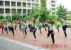 中國全面揭批“法輪功”非法活動后,福建積極開展打拳、習(xí)劍、跳舞、練健美操等群體活動。圖為一支來自“華武”中心的學(xué)員,八月三日在福建中醫(yī)學(xué)院內(nèi)習(xí)練太極劍。作者:劉瑞媛