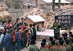 正在遼寧省遼西地區(qū)擔(dān)負(fù)光纜施工的解放軍沈陽軍區(qū)炮兵旅,針對駐地農(nóng)村封建迷信風(fēng)氣盛行的情況,對民眾進(jìn)行“破除迷信,崇尚科學(xué)”的教育和宣傳。作者:趙艷志