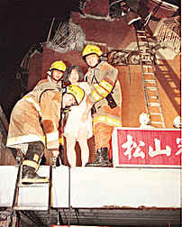 松山賓館倒塌,消防員將生還者救離現場。