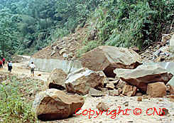 嘉義縣梅山鄉瑞峰村救災的人員,冒著隨時可能被落石砸到的危險,前往震區救災。中新社臺北傳真