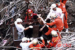 在臺北市地震中塌陷的東星大樓里被困一百三十小時的兩兄弟,二十六日獲救生還。二十歲的弟弟孫啟光首先被出。中新社臺北傳真