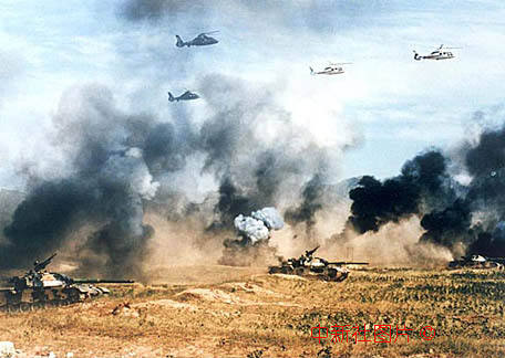 陸軍航空兵的武裝直升機掩護機械化部隊快速向“敵”縱深突擊
