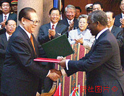 江澤民主席與南非總統姆貝基于二十五日共同簽署關于兩國伙伴關系的比勒陀利亞宣言。中新社記者 彭偉祥 攝