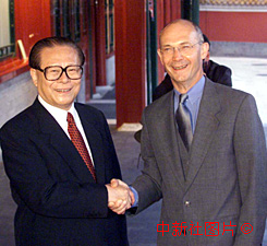 中歐十九日達成中國入世協議后,江澤民主席在會見歐盟貿易委員拉米一行。