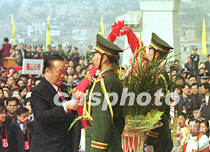 圖文:海內外華夏子孫公祭黃帝陵 2001年4月6日 08:01 ![]() 陜西黃帝陵大祭祖。中新社記者 宋吉河 攝 ![]() 王光英向軒轅黃帝畫像敬獻花籃。中新社記者 宋吉河 攝 ![]() 萬國權向軒轅黃帝畫像敬獻花籃。中新社記者 宋吉河 攝 中新社西安四月五日電(王彥平)清明節的黃帝陵,雨后初霽,陽光普照,農歷辛巳年公祭軒轅黃帝典禮今天在此隆重舉行。 今天在象征九五之尊的九點五十分,公祭典禮正式開始。全場肅立后,代表三十四個省、市、自治區和特別行政區的三十四響禮炮響起,人們的目光投向空中,仿佛在聆聽中國十二億九千五百萬華夏子孫和眾多海外同胞向中華人文初祖所要表達的殷殷懷念與追思。 海內外各界參祭代表,在入口廣場肅立靜候片刻后,隨古樸、莊嚴的祭祀儀俯隊,過軒轅橋觀龍尾道,來到軒轅廟前。 隨后鼓樂齊鳴,在威武的禮儀士兵引領下,全國人大常委會副委員長王光英、全國政協副主席萬國權等分別向黃帝像敬獻花籃。 在身著盛裝的禮儀小姐們向始祖敬獻了鮮花、時果等祭品后,陜西省省長程安東恭讀了辛巳年清明公祭軒轅黃帝祭文。 最后,所有參祭的各界代表向黃帝像行三鞠躬大禮。(完) |