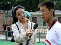 6月9日,加入“萬里行”車隊的影視明星劉蓓客串主持,采訪甘肅男子曲棍球隊。中新社圖 魏孝明 攝