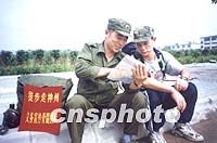 解放軍駐京某部前少校軍官隋繼國,以雙癌(腦癌和血癌)之軀徒步萬里,自費宣傳骨髓捐獻,二十八日抵達深圳。香港居民黃福榮為隋的壯舉所感動,中途加入,與隋同行。圖為隋繼國(左)與黃福榮在進入深圳市前一起研究行程。中新社記者 馮昶 攝