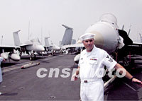 美國航空母艦“星座號(hào)”20日抵達(dá)香港,進(jìn)行補(bǔ)給及維修,并公開予傳媒參觀。圖為一名海軍士兵向傳媒介紹艦上設(shè)施。中新社傳真 盧峰 攝
