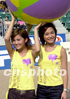 樂壇女子組合Twins兩位歌手蔡卓妍(右)、鍾思桐(左)22日出席世界女子沙灘排球香港公開賽,手持沙灘排球,表現健康活力形象。中新社傳真 鄧慶樂 攝