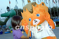來自中國澳門行政特區的“柏柏”,二十六日在大運會新聞中心外向路人親密地打招呼。作為澳門2005年東亞運動會的吉祥物,“柏柏”隨大運會澳門代表團來到北京來做宣傳。中新社記者 李剛 攝