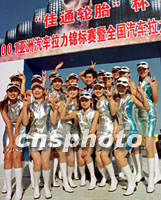 亞洲著名的佳通輪胎公司聘請臺灣著名藝人林志穎為其形象代表,在亞洲汽車拉力錦標賽上與漂亮小姐合影留念。中新社記者 趙振清 攝