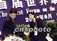 日本CCTV大富電視臺董事長張麗玲女士(右)十七日在南京舉行的首屆世界華文傳媒論壇上宣讀論文,演講后與主持人握手致謝。中新社記者 王瑤 攝