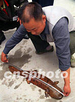 由于黑河引水工程,陜西省周至縣黑河大橋下游淺灘近日頻頻發(fā)現(xiàn)娃娃魚,大橋收費站的工作人員出于對珍稀動物的保護,準備將這條重三公斤、身長七十五厘米的娃娃魚尋找放生地,以保護這一地區(qū)的生態(tài)平衡。中新社圖 尚鴻珠 攝