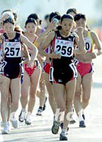 奧運冠軍王麗萍禮讓金牌 老將王妍折桂收山 2001年11月19日 10:59 ![]() 遼寧競走選手王妍(259號)十九日在中國第九屆全運會女子二十公里競走比賽中,以一小時二十六分二十二秒的成績打破亞洲紀錄并獲得冠軍。中新社記者 毛建軍 攝 ![]() 十九日,遼寧選手王妍在九運會田徑二十公里女子競走決賽中,以一小時二十六分二二的驚人成績打破亞洲紀錄,奪得該項目金牌。中新社記者 陳文 攝