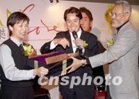 香港管弦樂團在著名指揮家葉詠詩領導下,將與樂壇長青樹譚詠麟首度合作,舉行名為「港樂·Alan Live」演唱會,18日在香港舉行記者會,譚詠麟向葉詠詩贈予貴重的純銀指揮棒,以表示其過人的音樂造詣。中新社傳真 鄧慶樂 攝