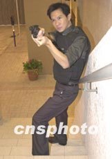 藝員張家輝20日到香港警察戰術大樓出席電視劇“勇探實錄”模擬訓練,他在“勇探實錄”中繹演一名重案組督察,圖為他在警察戰術大樓模擬持槍訓練。中新社傳真 鄧慶樂 攝
