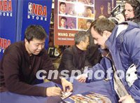 圖文:中國(guó)球員王治郅肖像郵票在紐約首次面世 2002年01月04日 14:26 ![]() 美東時(shí)間三日中午,美國(guó)職業(yè)籃球協(xié)會(huì)中唯一的中國(guó)球員王治郅出席了紐約市中心NBA專賣店里舉行的他個(gè)人肖像郵票首次公開展示會(huì)。這套郵票由利比里亞政府發(fā)行,可在全球通用。會(huì)后,他為慕名前來(lái)的美國(guó)球迷簽字。中新社記者 陳建 攝 ![]() 美國(guó)職業(yè)籃球協(xié)會(huì)、BDA體育管理中心、國(guó)際政府集郵代理機(jī)構(gòu)今天宣布,將發(fā)行一套以美國(guó)達(dá)拉斯小牛隊(duì)中鋒王治郅肖像為主題的法定郵票。王治郅出席了紐約市中心NBA專賣店中舉行的郵票首次公開展示會(huì)并在展板上簽字。中新社記者 陳建 攝