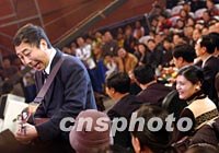 中國笑星馮鞏在央視春節聯歡晚會中,抱著吉它下到觀眾席演出相聲《臺上臺下》,他的同伴郭冬臨、陸鳴在臺上呼應。中新社記者 王麗南 攝