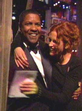 當獲獎的黑人演員丹佐·華盛頓(Denzel Washington)登上領獎臺后,朱麗婭·羅伯茨熱烈擁抱華盛頓,久久不肯撒手,就連頒獎完他們雙雙走向后臺時,“大嘴美女”還吊著華盛頓的肩膀不放。而本屆奧斯卡最佳男女主角獎也均被黑人影星奪得。