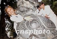 幾名來自臺灣的女士清明前在陜西黃陵撫摩黃帝陵守護神,以辟邪消災。清明節到來之際,每天都有大批臺灣及港澳地區的游客來此朝拜。中新社圖 武仲林 攝