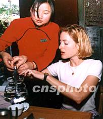 圖:美國姑娘向中國茶藝小姐學習茶道