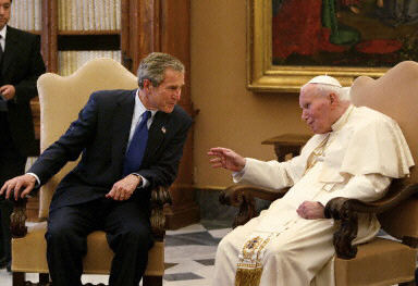 美國總統布什在梵蒂岡與羅馬教皇約翰·保羅二世舉行短暫會晤。會晤中談及有關中東危機和美國羅馬天主教性丑聞等問題。法新供中新