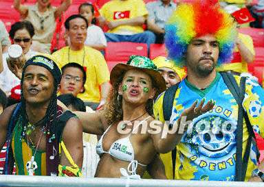 6月3日下午,韓日世界杯C組巴西與土耳其隊(duì)的比賽正在韓國(guó)蔚山文竹體育場(chǎng)進(jìn)行。圖為看臺(tái)上身穿比基尼的女球迷。