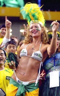 北京時間6月26日晚,韓日世界杯第二場半決賽巴西隊VS土耳其隊的比賽將在日本琦玉體育場進行。圖為看臺上巴西女球迷身著比基尼翩翩起舞。