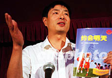 著名演員、新上任的北京市禁毒教育義務宣傳員濮存昕,二十六日在北京市禁毒教育基地向中小學生介紹《約會明天:2002年中國青少年禁毒教育讀本》的內容。作者:杜洋