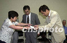 花岡事件受難者聯(lián)誼會2日在日本國會發(fā)表《致日本內(nèi)閣函》,要求日本政府正視強擄、奴役中國戰(zhàn)俘勞工的歷史,承擔(dān)政治、法律、道義上的責(zé)任,公開、正式地向中國人民謝罪。圖為受難者家屬代表王紅向日本國會議員提交函件。中新社記者 陶光雄 攝