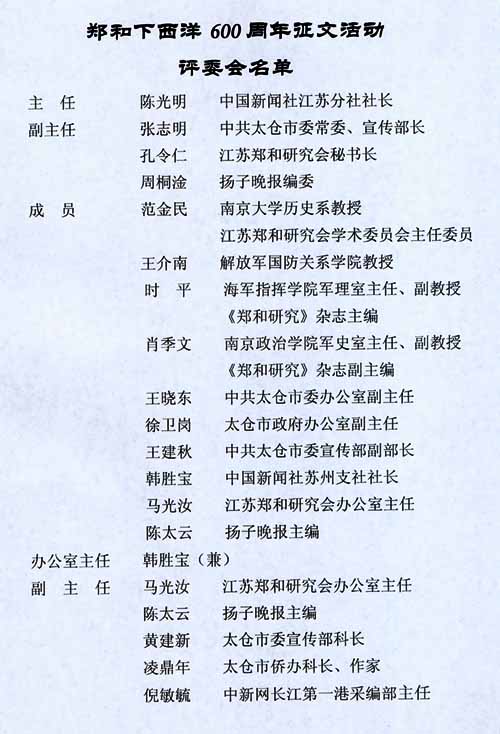 “鄭和下西洋600周年”征文啟示 2002年07月05日 10:36 ![]() 鄭和下西洋600周年征文活動評委會名單 為紀念鄭和下西洋600周年,弘揚鄭和開放和探險精神,進一步提升鄭和七下西洋起錨地太倉的知名度,促進太倉的兩個文明建設和經濟發展,特舉行征文活動。 一、征文時間 從2002年7月11日起(鄭和下西洋紀念日)至2003年7月11日止。 二、征文內容 圍繞鄭和七下西洋起錨地太倉與鄭和,從歷史與現實的結合上,從跨越600年的時間和空間中,從不同視角充分展示鄭和精神及給太倉歷史、經濟、文化等方面帶來的影響。 三、征文形式 1、學術論文類; 2、文學類,包括小說、散文、隨筆、詩歌、故事、盈聯等; 3、新聞類,包括消息、通訊、特寫、專訪、述評等。 四、征文字數 論文一般不超過5000字;文學作品一般不超過3000字(長、中篇小說例外);新聞一般不超過1500字。 五、征文刊用 征文作品在中新江蘇網、中新網長江第一港、揚子晚報“聚焦蘇錫常”專版、《鄭和研究》雜志刊用。 六、征文評比 征文頒獎活動在2003年9月份舉行,評出論文類、文學類、新聞類一等獎各一名,獎金3000元;二等獎各三名,獎金1500元;三等獎各五名,獎金500元,另評出榮譽獎若干名。 七、征文請寄江蘇省太倉市體育東路58號,中新網長江第一港編輯部,郵編215400。另電子文檔以word形式保存,寄jiangzhenjiang@chinanews.com.cn作者請自留底稿,所有應征作品一律不退稿。 八、本次征文活動解釋權在征文活動組委會。 主辦單位:太倉市委、市人民政府 中國新聞社江蘇分社 揚子晚報“聚焦蘇錫常”編輯部 江蘇鄭和研究會 二OO二年七月一日