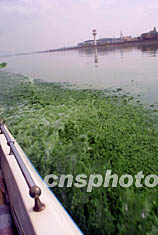昆明滇池個別水域最近綠藻泛濫,污染嚴(yán)重。快艇駛過時激起綠色的浪花,臭氣熏天。中新社記者 史利 攝