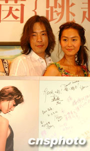 香港明星朱茵EP“跳起來”唱片十八日面世。這張唱片專輯由黃貫中監(jiān)制,共收錄七首歌曲。圖為十七日朱茵與黃貫中在香港出席“跳起來”發(fā)布會。中新社傳真 潘索菲 攝