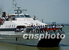 七月二十五日下午,乘載泉州天后宮媽祖金身的臺(tái)灣“超級(jí)星”號(hào)客輪駛離泉州后渚港,直航返回澎湖。作者:華小銳