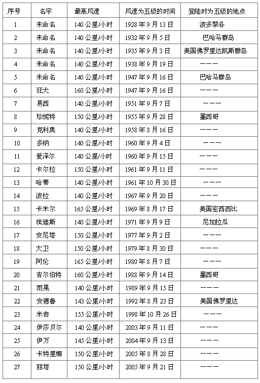 大西洋史上發(fā)生颶風(fēng)的次數(shù)總共是27次,只有9次登陸時風(fēng)速仍然保持在五級,其中三次登陸時仍保持五級的颶風(fēng)都發(fā)生在美國境內(nèi),包括1935年在佛羅里達(dá)州登陸的“凱斯”颶風(fēng)、1969年襲擊密西西比的“卡米爾”颶風(fēng)、1992年襲擊佛羅里達(dá)州的“安德魯”颶風(fēng)。