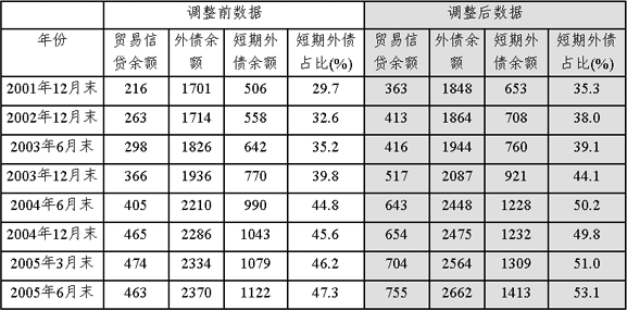 2001-2005年6月末貿易信貸統(tǒng)計方法調整前后外債有關指標對比