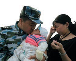 碼頭上滿是歡送的人群,其中最引人注目的是官兵的妻子們。這是一群偉大的女性,大家都親切地叫她們“礁嫂”。她們既有自己的工作,又要在分居的日子里獨(dú)自操持家務(wù),孝敬老人,撫育孩子,還要為守衛(wèi)孤礁的丈夫擔(dān)驚受怕。昨天下午,我們同幾名“礁嫂”座談,說起自己的丈夫和家庭,她們一會兒哭,一會兒笑,一會兒令人心酸,一會兒讓人開懷,以致所有記者都對她們肅然起敬。今天,這些“礁嫂”一遍又一遍地?fù)崦碇煞蛐厍暗拇蠹t花,情不自禁地淚流滿面。