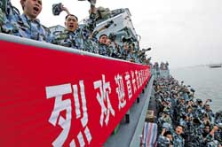 軍艦解纜離港的瞬間,列隊(duì)右甲板的官兵中間,突然爆發(fā)出一陣陣豪邁而又深情的呼喊:“戰(zhàn)友再見!親人再見!”喊聲如驚雷,滾過大海,躍上云霄,震撼心扉,令人動容。