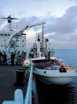 從清晨5時(shí)起,為永暑礁補(bǔ)給物資的工作就開始了。先是一艘拖船靠上我們的補(bǔ)給艦,然后補(bǔ)給艦上的吊車把各種物資一一吊裝到拖船上,甲板上一片忙碌。
