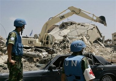 在以軍25日對黎巴嫩南部邊境城鎮的轟炸中,一個隸屬聯合國駐黎巴嫩臨時部隊的聯合國觀察站被炸,4名聯合國觀察員遇難,其中包括中國聯合國觀察員杜兆宇。圖為中國維和士兵清理轟炸現場。(春風)