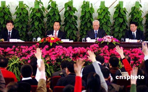 三月九日,十一屆全國人大一次會議在北京人民大會堂舉行記者招待會,由勞動和社會保障部部長田成平、副部長孫寶樹和民政部部長李學舉、常務副部長李立國,就勞動就業和社會保障問題答記者問。中新社發 王東明 攝