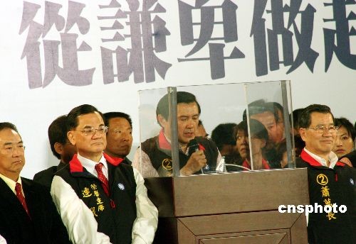 3月22日,臺灣舉行大選投票,結果中國國民黨候選人馬英九、蕭萬長以221萬票的領先優勢獲勝,當晚大批支持者在馬蕭競選總部前集會歡慶。圖為馬英九在蕭萬長、國民黨榮譽主席連戰、主席吳伯雄、親民黨主席宋楚瑜、“立法院長”王金平陪同下,在現場發表演講。中新社發 黃少華 攝