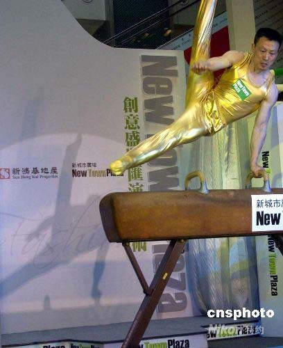 四月三十日,沙田一商場為慶祝奧運馬術(shù)比賽在香港舉行,特別邀請亞特蘭大奧運會鞍馬冠軍李東華作表演。李東華作為瑞士2008年奧運會國家代表團(tuán)的特使,為瑞士贏得近百年來的首枚體操奧運金牌。中新社發(fā) 譚達(dá)明 攝