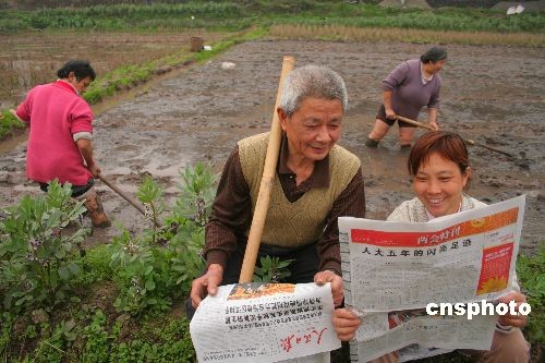 3月5日,重慶榮昌縣杜家壩村農(nóng)民在春耕的休息間隙,一起閱讀登載有兩會消息的人民日報。連日來人民日報上“兩會特刊”中有關(guān)農(nóng)民生產(chǎn)、糧食生產(chǎn)與新農(nóng)村建設(shè)等方面的相關(guān)信息,引起當(dāng)?shù)卮焊r(nóng)民的密切關(guān)注。中新社發(fā) 朱蕓鋒 攝