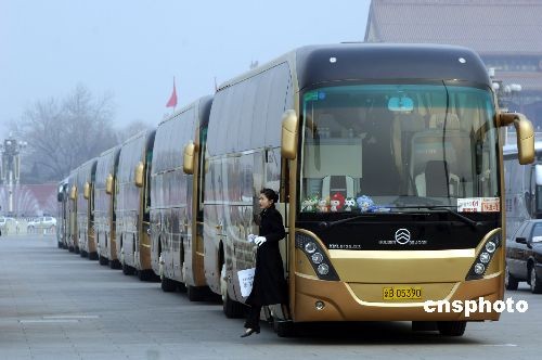 2008年3月8日,停在北京天安門廣場、全國政協十一次會議會場外的環保節能大巴。據悉,這種平均百公里油耗不到5升的環保大巴是首汽首次為“兩會”代表團提供服務。此外,為營造奧運年氣氛,“兩會”服務車的內前擋風玻璃下方都擺放了北京奧運會吉祥物福娃。中新社發 張朋 攝