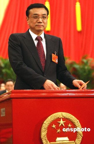 3月17日下午,十一屆全國人大一次會議在北京人民大會堂舉行第七次全體會議,會議根據(jù)國務(wù)院總理溫家寶的提名,以無記名投票方式表決,決定李克強、回良玉(回族),張德江、王岐山為國務(wù)院副總理,劉延?xùn)|(女)、梁光烈、馬凱、孟建柱、戴秉國(土家族)為國務(wù)委員人選。馬凱(兼)為國務(wù)院秘書長人選。圖為李克強在會場投票。中新社發(fā) 任晨鳴 攝