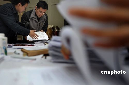 全國(guó)政協(xié)十一屆一次會(huì)議委員提案接收工作于三月九日下午兩點(diǎn)截止,圖為大會(huì)提案組辦公室工作人員在清點(diǎn)提案。中新社發(fā) 廖攀 攝