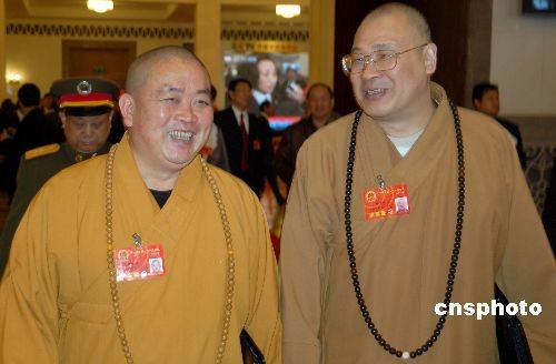 3月10日上午,十一屆全國人大一次會議在北京人民大會堂舉行第三次全體會議,中國佛教協會副會長、河南省佛教協會會長、河南省少林寺方丈釋永信(左),中國佛教協會常務副會長、湖南省佛教協會會長釋圣輝共同出席。中新社發 劉萬強 攝